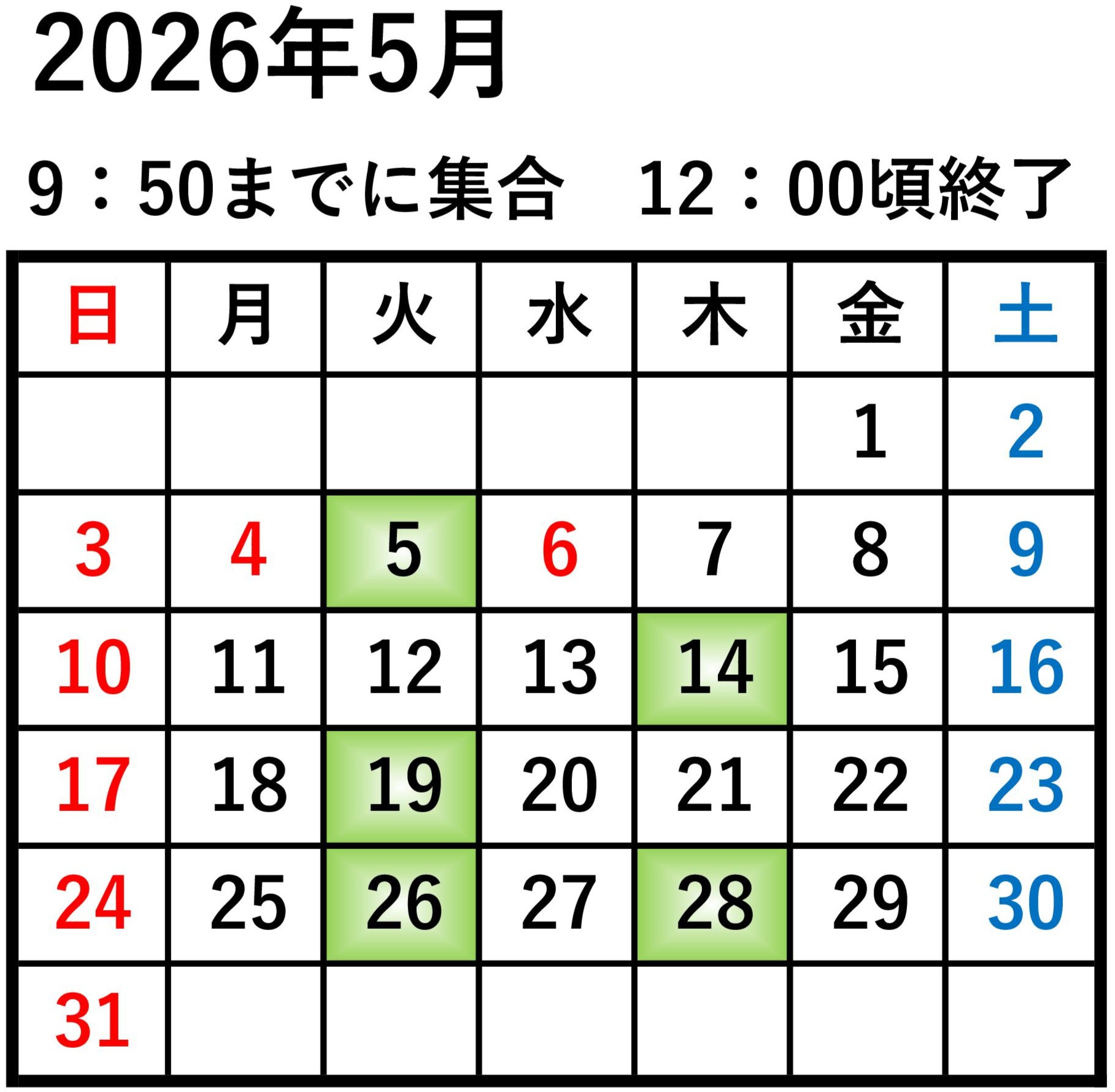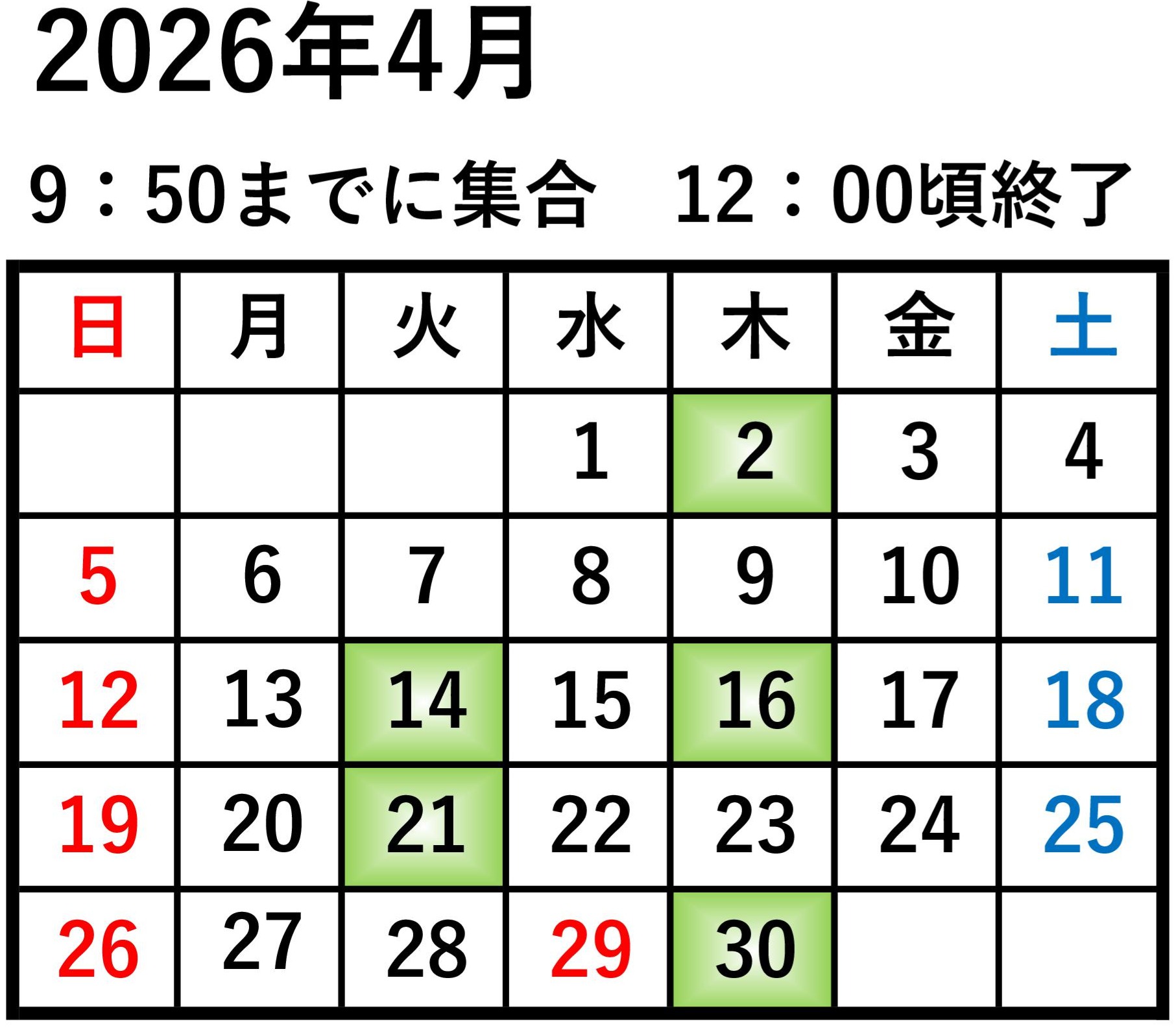 7月、9月は、夏季早朝開催の8:50までに集合 11:00頃終了です。